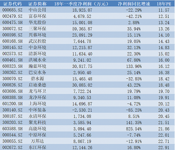界面新聞梳理了全部環(huán)保板塊上市公司一季報業(yè)績以及當前情況下的市盈率水平,具體情況如下表所示(下表中“預(yù)測PE”為根據(jù)多家券商一致性預(yù)測出的2018年凈利潤及5月7日收盤價所計算出的市盈率):