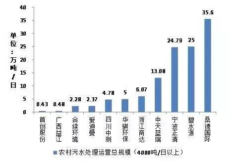 其中,農(nóng)村污水處理運(yùn)營(yíng)總規(guī)模大于4000噸/日以上企業(yè)排名如下圖所示: