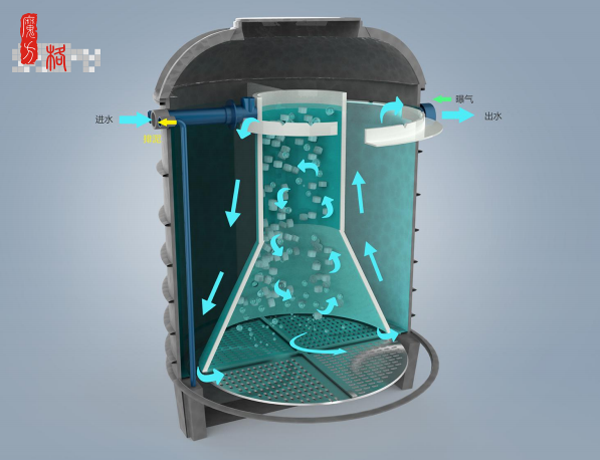 魔方格產(chǎn)品。主要是針對(duì)村落分散處理模式,單套5m3/d,可串并聯(lián)組合使用。裝備采用“渦輪循環(huán)往復(fù)泥膜耦合脫氮除磷技術(shù)”,它是利用渦輪反應(yīng)區(qū)的水氣動(dòng)力形成高度流化并自流至缺氧厭氧區(qū)形成往復(fù)循環(huán)處理,實(shí)現(xiàn)有機(jī)物及氮磷的去除。其技術(shù)優(yōu)勢(shì)中部的流化床狀態(tài),傳質(zhì)效果好,微生物活性強(qiáng),耐沖擊負(fù)荷強(qiáng),去除效果穩(wěn)定;同時(shí)整個(gè)設(shè)備僅配置一臺(tái)進(jìn)口氣泵,故障點(diǎn)少,運(yùn)行節(jié)能穩(wěn)定。另外設(shè)備采用高分子材料一次成型,使用壽命長(zhǎng)所以特別適合農(nóng)村小微場(chǎng)合應(yīng)用。