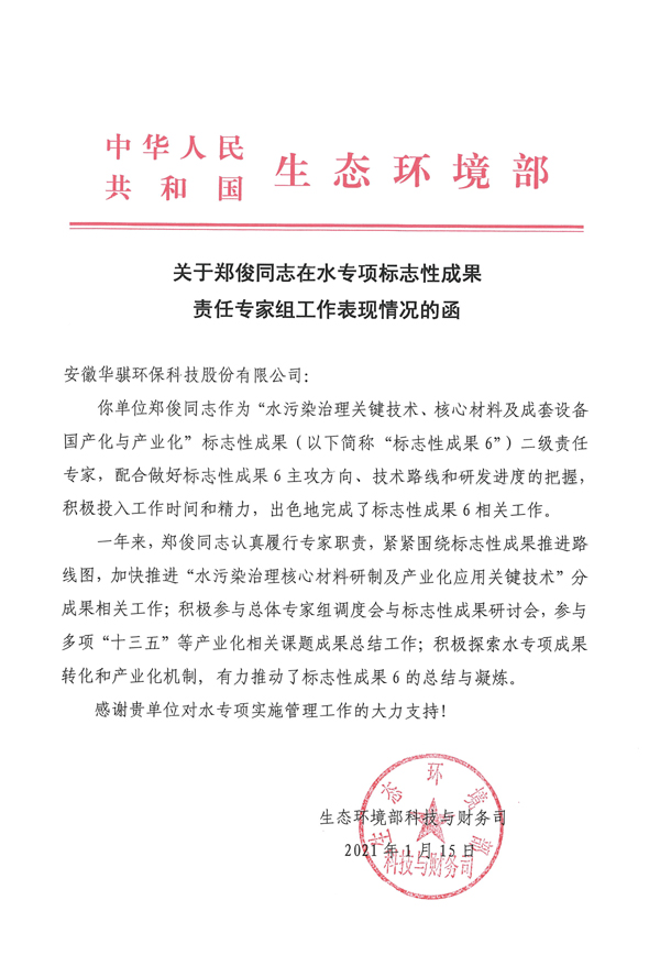 近日,國家生態(tài)環(huán)境部給安徽華騏環(huán)保科技股份有限公司發(fā)來了感謝信,對華騏環(huán)保副董事長兼總工程師鄭俊先生作為“水污染治理關(guān)鍵技術(shù)、核心材料及成套設(shè)備國產(chǎn)化與產(chǎn)業(yè)化”標(biāo)志性成果二級責(zé)任專家期間的出色工作表示肯定與感謝。