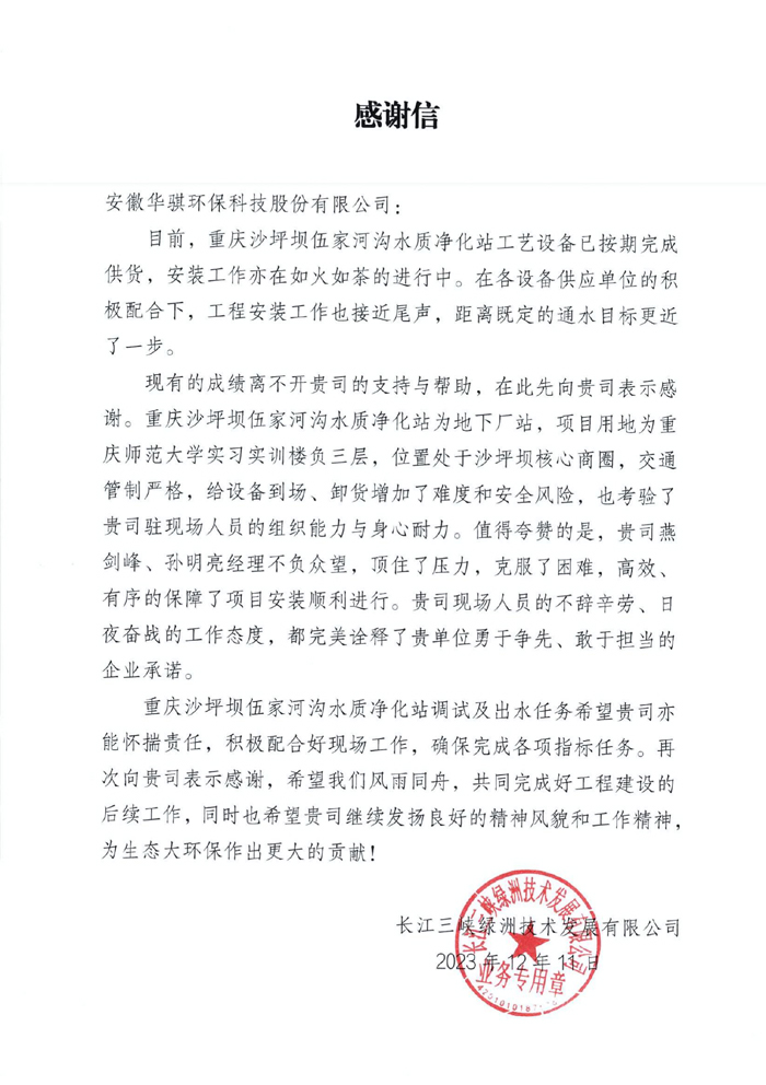 近日,長江三峽綠洲技術(shù)發(fā)展有限公司向安徽華騏環(huán)??萍脊煞萦邢薰景l(fā)來感謝信,對華騏環(huán)保工作人員在建設(shè)重慶沙坪壩伍家河溝水質(zhì)凈化站項目過程中,高效、有序的保障了項目順利安裝表示高度贊揚與衷心感謝。