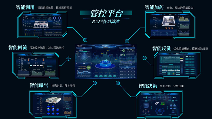 BAF智慧濾池?fù)碛兄悄苷{(diào)用、智能回流、智能反洗、智能加藥、智能曝氣、智能決策六大板塊,六駕“馬車”齊發(fā)力,充分發(fā)揮AI 人工智能在水廠運(yùn)營中的有力作用。智能調(diào)用系統(tǒng)自動計算濾池運(yùn)行數(shù)量,根據(jù)用戶需求交替啟用,確保冬季低溫下出水水質(zhì)穩(wěn)定達(dá)標(biāo),同時降低曝氣能耗;智能回流系統(tǒng)實(shí)時調(diào)控回流比,解決了硝化液回流過量的問題,確保濾池精準(zhǔn)脫氮,大幅節(jié)省電耗;針對不同功能的濾池,智能反洗系統(tǒng)通過選用循環(huán)洗、降水位反沖洗、強(qiáng)制反洗等模式,提高反洗效率,降低反洗頻次,節(jié)省電耗;智能加藥系統(tǒng)結(jié)合進(jìn)水水質(zhì)水量,AI智能投加反硝化碳源,確保總氮達(dá)標(biāo)的前提下大幅度降低藥耗;智能曝氣系統(tǒng)充分考慮氣泡經(jīng)濾料剪切帶來溶解氧升高的影響,實(shí)現(xiàn)按需供氧,降低曝氣能耗;智能決策系統(tǒng)根據(jù)運(yùn)營需求,對不同控制模塊的經(jīng)濟(jì)性、安全性、穩(wěn)定性進(jìn)行綜合比選,制定精準(zhǔn)、有效的控制方案。