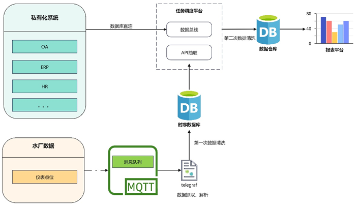 華騏環(huán)保以含山西區(qū)污水處理廠為試點(diǎn),率先建成“全數(shù)字化運(yùn)營水廠”,通過引入高性能時(shí)序數(shù)據(jù)庫實(shí)現(xiàn)對(duì)設(shè)備狀態(tài)、運(yùn)行參數(shù)、水質(zhì)監(jiān)測、水量計(jì)算、能耗與藥耗等海量數(shù)據(jù)的高并發(fā)采集與傳輸,并通過分庫、分表架構(gòu)并結(jié)合不同工藝結(jié)構(gòu)完成多源異構(gòu)數(shù)據(jù)的統(tǒng)一存儲(chǔ)與快速響應(yīng)。整體技術(shù)架構(gòu)不僅解決了傳統(tǒng)水廠數(shù)據(jù)孤島問題,更通過標(biāo)準(zhǔn)化數(shù)據(jù)接口為上層智能應(yīng)用提供“原料”,達(dá)成智能化決策輸出。目前,數(shù)據(jù)平臺(tái)日均處理全自營廠數(shù)據(jù)量超百萬條,統(tǒng)一存儲(chǔ)運(yùn)行數(shù)據(jù)達(dá)38億條,為后續(xù)的算法提優(yōu)與模型泛化奠定了堅(jiān)實(shí)的數(shù)字化基礎(chǔ)。