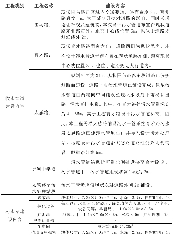 本項目新建污水處理站一座,規(guī)模為800t/d。新建污水管網(wǎng)5.75公里,管徑為DN400-DN600,采用開挖、牽引相結(jié)合的施工方式。建設項目工程組成見表1。