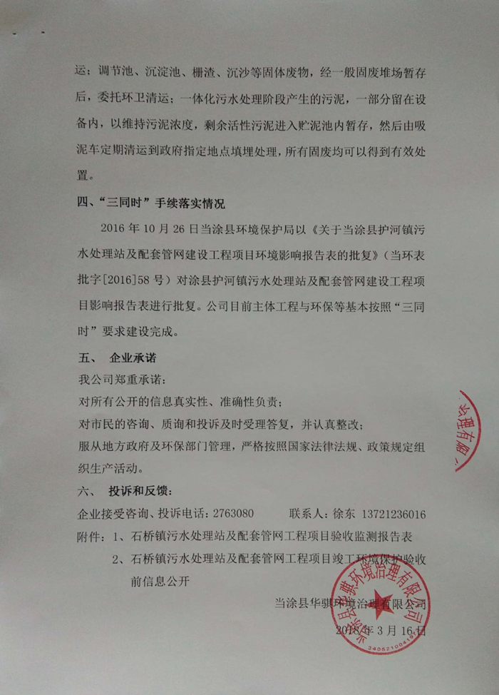 2016年10月26日當涂縣環(huán)境保護局以《關于當涂縣護河鎮(zhèn)污水處理站及配套管網(wǎng)建設工程項目環(huán)境影響報告表的批復》(當環(huán)表批字[2016]58號)對涂縣護河鎮(zhèn)污水處理站及配套管網(wǎng)建設工程項目影響報告表進行批復。公司目前主體工程與環(huán)保等基本按照“三同時”要求建設完成。