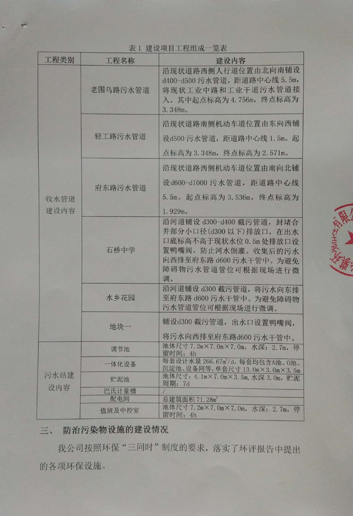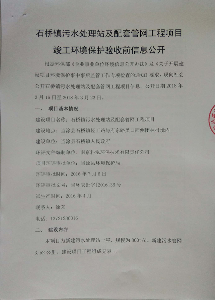 2016年7月6日當(dāng)涂縣環(huán)境保護(hù)局以《關(guān)于當(dāng)涂縣石橋鎮(zhèn)人民政府石橋鎮(zhèn)污水處理站及配套管網(wǎng)工程環(huán)境影響報(bào)告表的批復(fù)》(當(dāng)環(huán)表批字[2016]36號(hào))對(duì)當(dāng)涂縣石橋鎮(zhèn)人民政府石橋鎮(zhèn)污水處理站及配套管網(wǎng)工程環(huán)境影響報(bào)告表進(jìn)行批復(fù)。公司目前主體工程與環(huán)保等基本按照“三同時(shí)”要求建設(shè)完成。