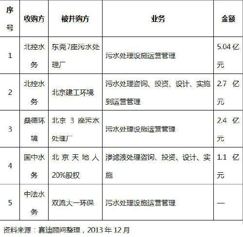隨著一系列促進(jìn)污水處理行業(yè)發(fā)展的政策密集出臺,對污水處理行業(yè)的樂觀預(yù)期吸引了大量投資機(jī)構(gòu)跨行業(yè)、跨領(lǐng)域進(jìn)入污水處理領(lǐng)域。在上市公司中,湘鄂情收購江蘇中昱環(huán)??萍加邢薰?1%股權(quán),后者是一家包含水處理業(yè)務(wù)和廢氣處理業(yè)務(wù)的綜合環(huán)保公司,資本市場給予其兩個漲停板的反應(yīng);香梨股份100%收購新疆昌源水務(wù),復(fù)盤收獲三個漲停板。在污水處理行業(yè)內(nèi)部,2013年也掀起了一輪并購熱潮。北控水務(wù)、桑德環(huán)境等大型水處理企業(yè)全力出擊,并購多家企業(yè)。