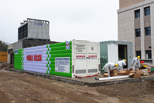 2月24日,第一套日處理醫(yī)療廢水200噸的“邁巴?!闭较戮€。次日,“邁巴?!本秃?位員工一道奔赴黃岡。目前,4位員工不懼風(fēng)險(xiǎn),正在黃岡傳染病醫(yī)院加緊安裝、調(diào)試“邁巴?!奔皬U水消毒、廢氣收集處理和滅菌系統(tǒng)。安裝時(shí)間需要4天,之后,“邁巴?!睂⒄健盎鹁€上崗”。