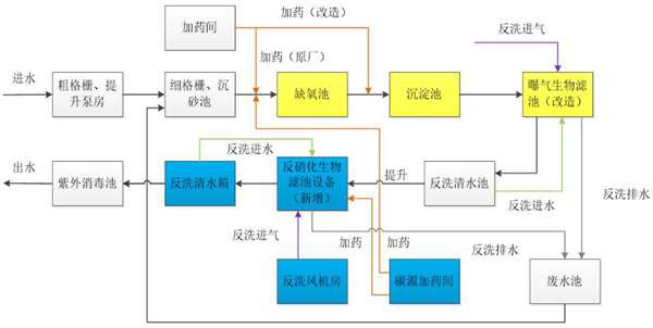 仁壽縣城市生活污水處理廠改造提升工程日平均處理污水量為2.0萬立方米。廠區(qū)主體工藝采用“缺氧池、沉淀池+BAF曝氣生物濾池”處理工藝,經(jīng)處理后的污水水質(zhì)排放標(biāo)準(zhǔn)為《城鎮(zhèn)污水處理廠污染物排放標(biāo)準(zhǔn)》(GB18918-2002)一級(jí)A排放標(biāo)準(zhǔn)。改造后采用“缺氧池、沉淀池+BAF曝氣生物濾池+反硝化魔方尊”處理工藝。改造后出水指標(biāo)需滿足《四川省岷江、沱江流域水污染排放標(biāo)準(zhǔn)》。