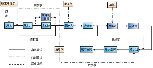重慶市悅來水廠二期工程設(shè)計規(guī)模20×104m3/d,位于重慶市渝北區(qū)悅來街道及雙龍湖街道,主要工程內(nèi)容包括取水工程、凈水工程、輸配水?dāng)U建工程。水源地選擇在水量充沛、水質(zhì)較好的嘉陵江悅來段,一期取水工程已按40.0萬m3/d進行土建,本期設(shè)備增容20.0萬m3/d。凈水工程主要生產(chǎn)構(gòu)筑物按20.0萬m3/d建設(shè),凈水廠工藝流程采用常規(guī)凈水處理+深度處理工藝。常規(guī)凈水處理工藝為沉砂+絮凝沉淀+過濾+消毒,深度處理工藝為O3-BAC。管網(wǎng)輸配水能力按2020年60.0萬m3/d總體布置,分期分步實施。