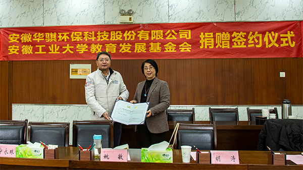2022年1月14日,安徽華騏環(huán)保科技股份有限公司與安徽工業(yè)大學戰(zhàn)略合作簽約儀式在安徽工業(yè)大學會議中心舉行。華騏環(huán)保董事長王健,副總胡一強、費煜青,安工大副校長顧明言,校友處處長、教育發(fā)展基金會秘書長甘亞,體育部黨總支書記、主任胡濤,工會主席姚敏,學生工作部(處)處長何偉,團委書記王菁,校友工作處副處長、教育發(fā)展基金會副秘書長寧永球,體育部副主任程小坡出席了簽約儀式。體育部副主任李艷主持本次簽約儀式。此次簽約旨在為支持安徽工業(yè)大學教育事業(yè)的發(fā)展,支持安徽工業(yè)大學校園科技文化體育活動。